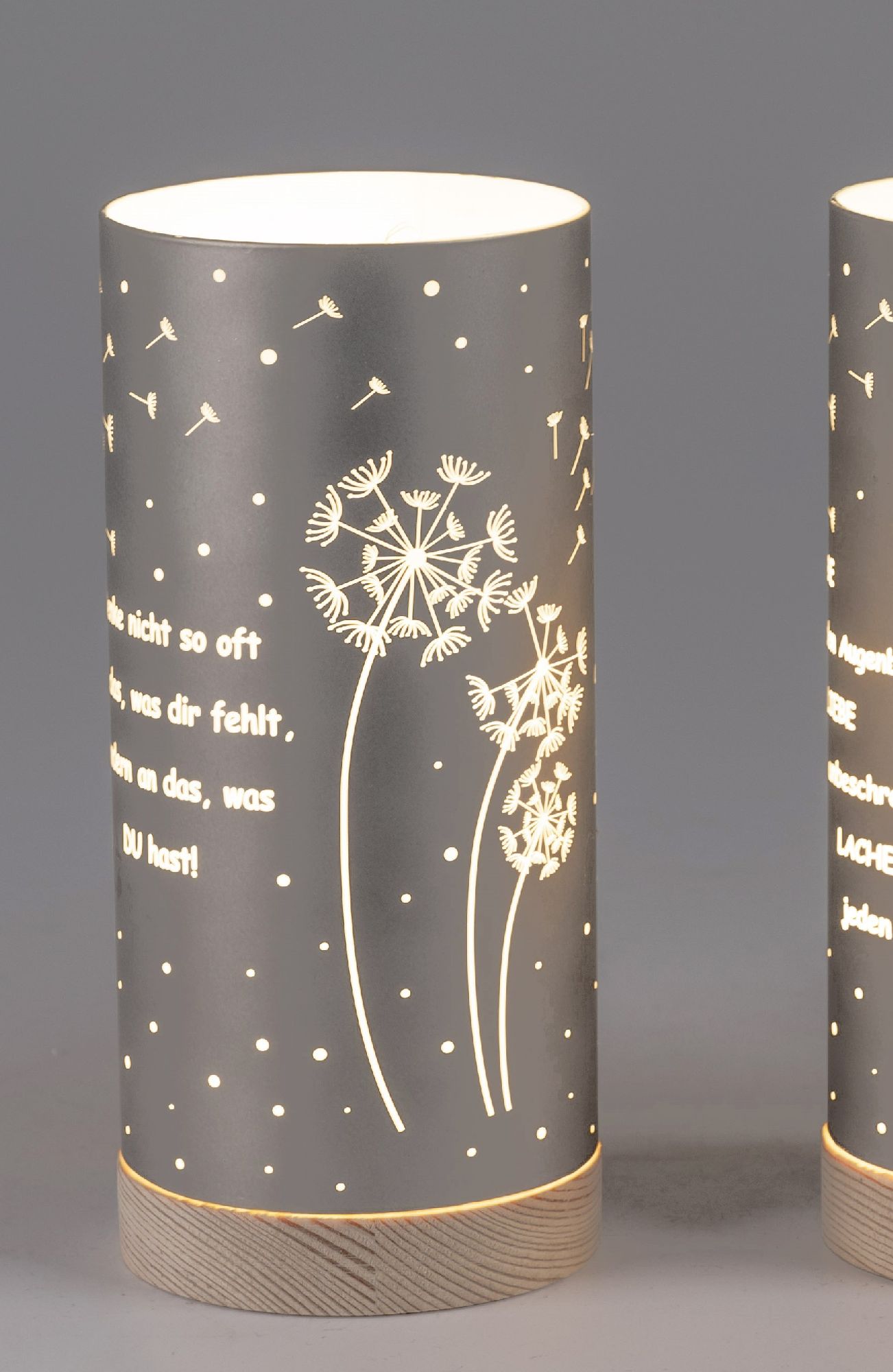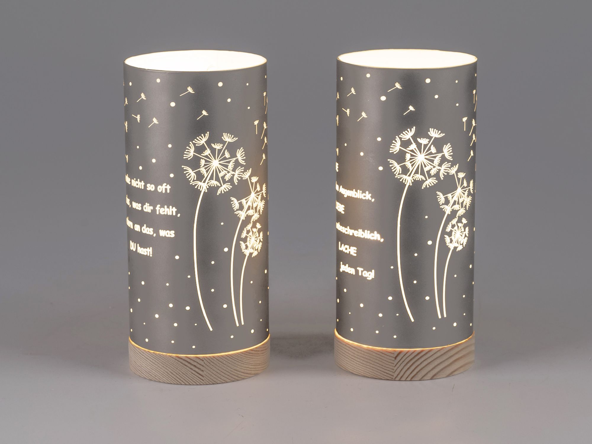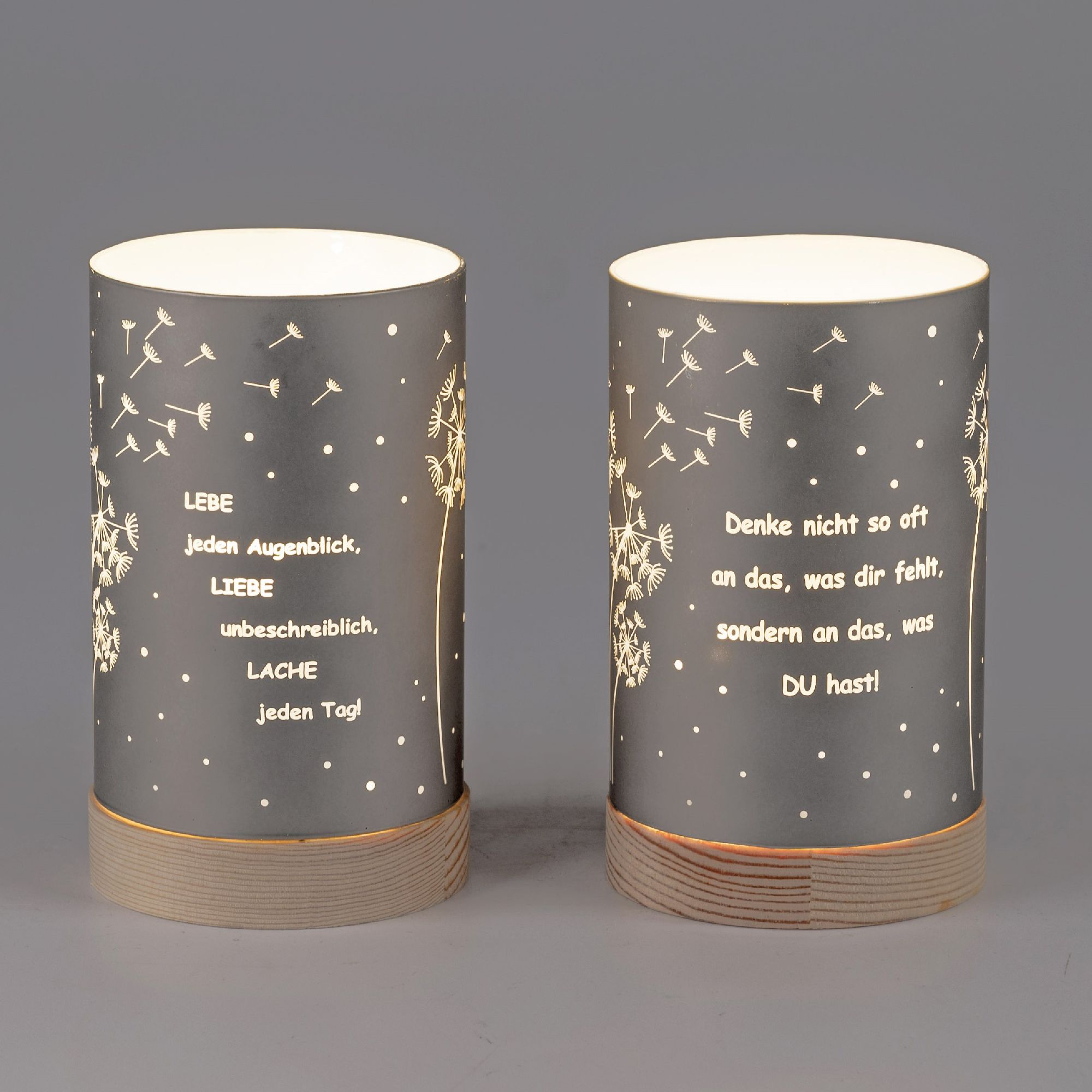 2er Set LED Tischlampen mit Sprüchen H. 15cm grau aus Glas mit Timer Formano