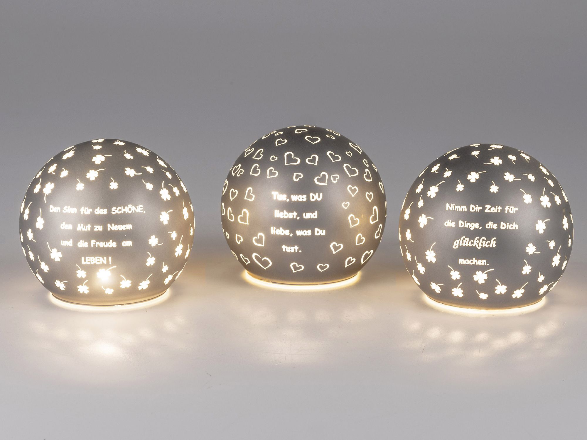 3er Set LED Kugellampen mit Spruch D. 10cm grau aus Glas mit Timer Formano