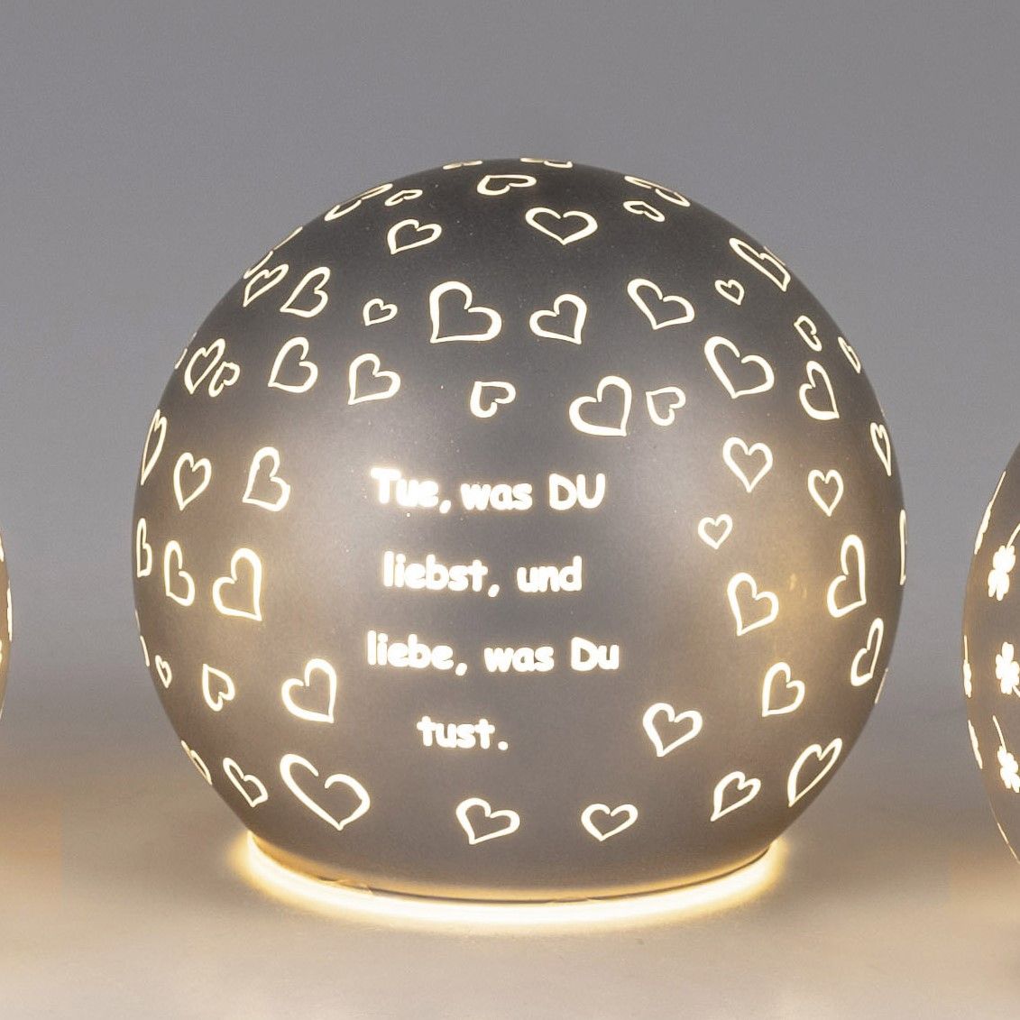 LED Kugellampe mit Spruch Tue was du liebst… D. 12cm grau mit Timer Formano