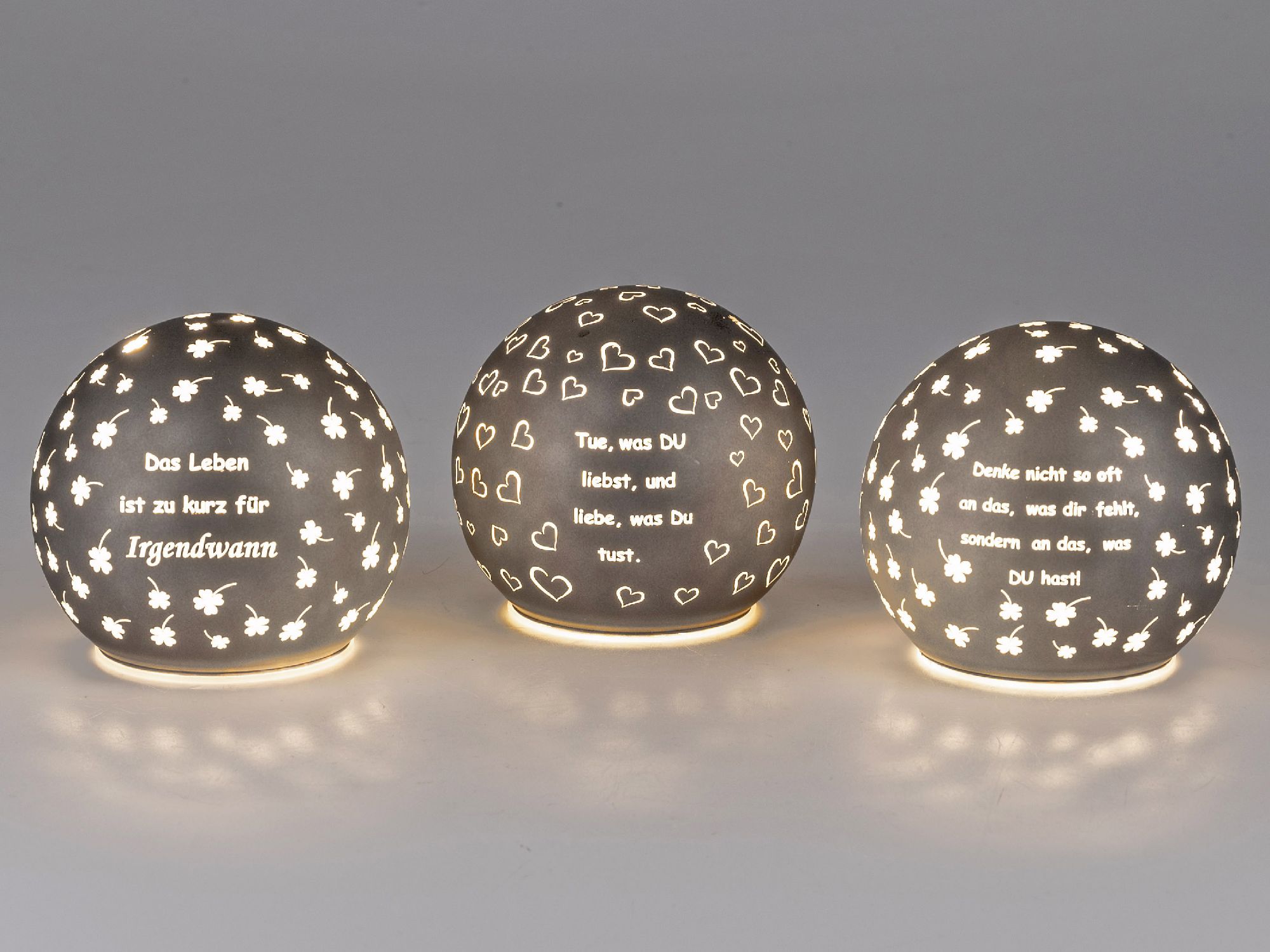 3er Set LED Kugellampen mit Spruch D. 10cm grau aus Glas mit Timer Formano