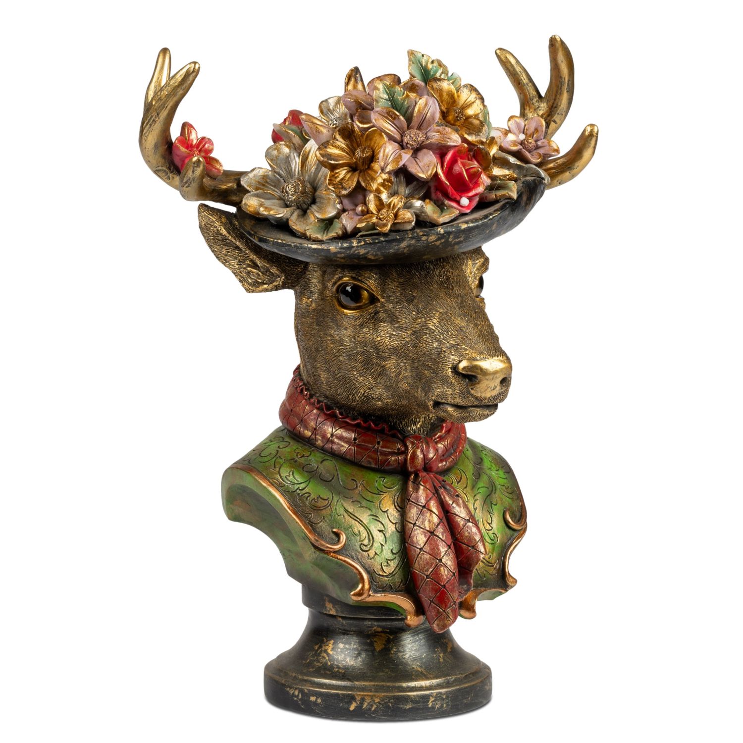 Dekoobjekt Büste Hirsch mit Hut mit Blumendekor H. 39cm Kunststein Formano
