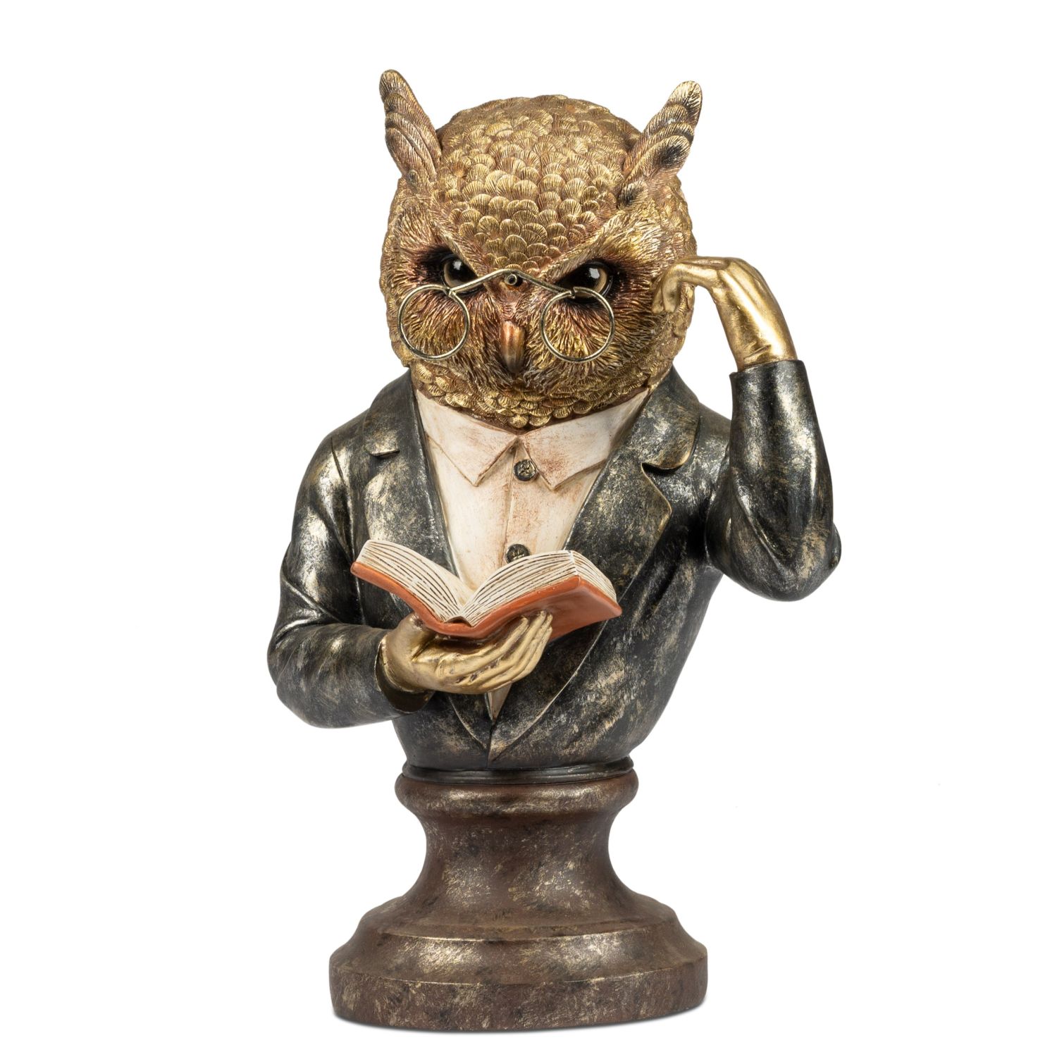 Dekoobjekt Büste Eule im Anzug mit Brille und Buch H. 36cm antikfarben Formano