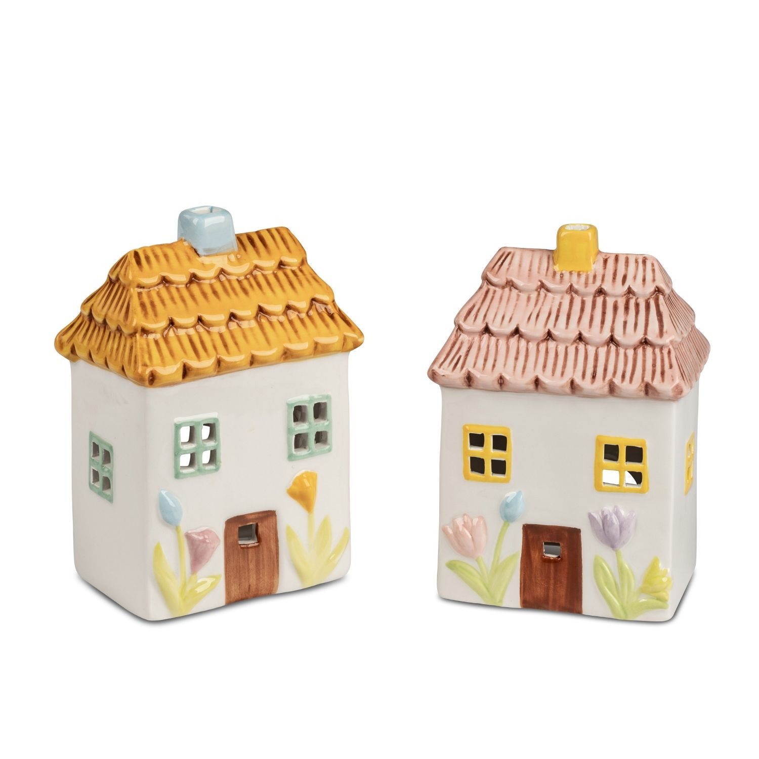 2er Set Windlichter Häuser mit Blumendekor H. 15cm weiß bunt Formano F26